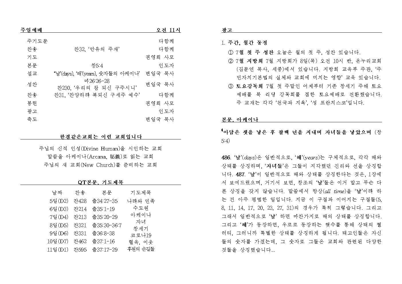 487. ‘날’이 일반적으로 때와 상태를 상징한다는 것을 1장에서 보여드렸는데, 거기 보면, 첫째 날, 둘째 날 등 창조의 ‘날’이 때와 상태 말고 무슨 다른 걸 상징하지 않습니다. That by “days” are signified times and states in general, was shown in the first chapter, where the “days” of creation have no other signification.